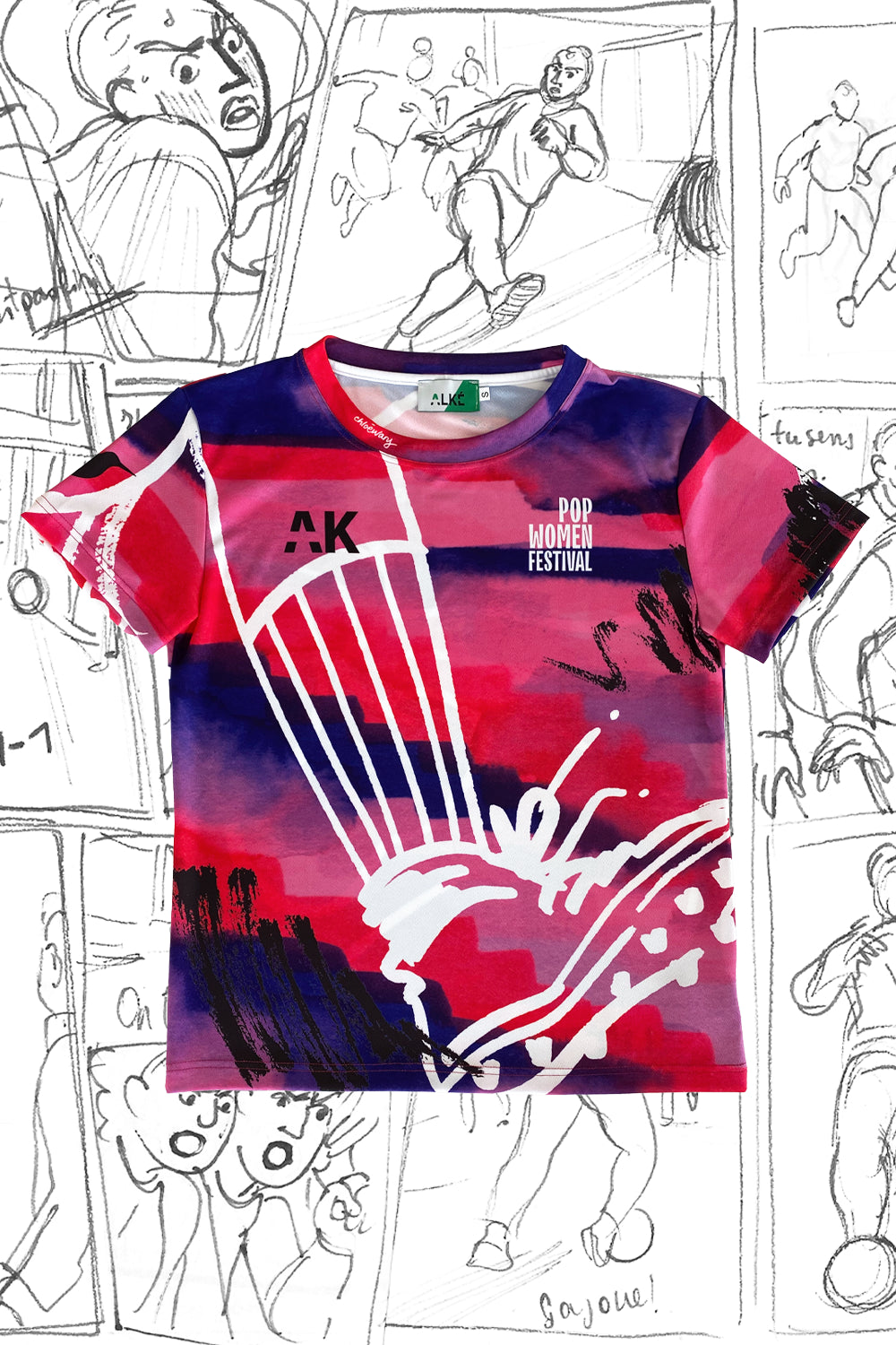 À l'occasion du 8 mars et du Pop Women Festival, ALKÉ s'est associé à l'artiste Chloé Wary pour lancer un maillot inédit, symbole d'une rencontre entre deux univers créatifs et puissants. Cette collaboration raconte l’histoire d’un rapprochement il y a 5 ans entre Claire, co-fondatrice d'ALKÉ, et Chloé, dessinatrice et autrice de BD. Ensemble, elles ont fusionné leurs passions pour créer une pièce unique célébrant à la fois le football féminin et l’art.